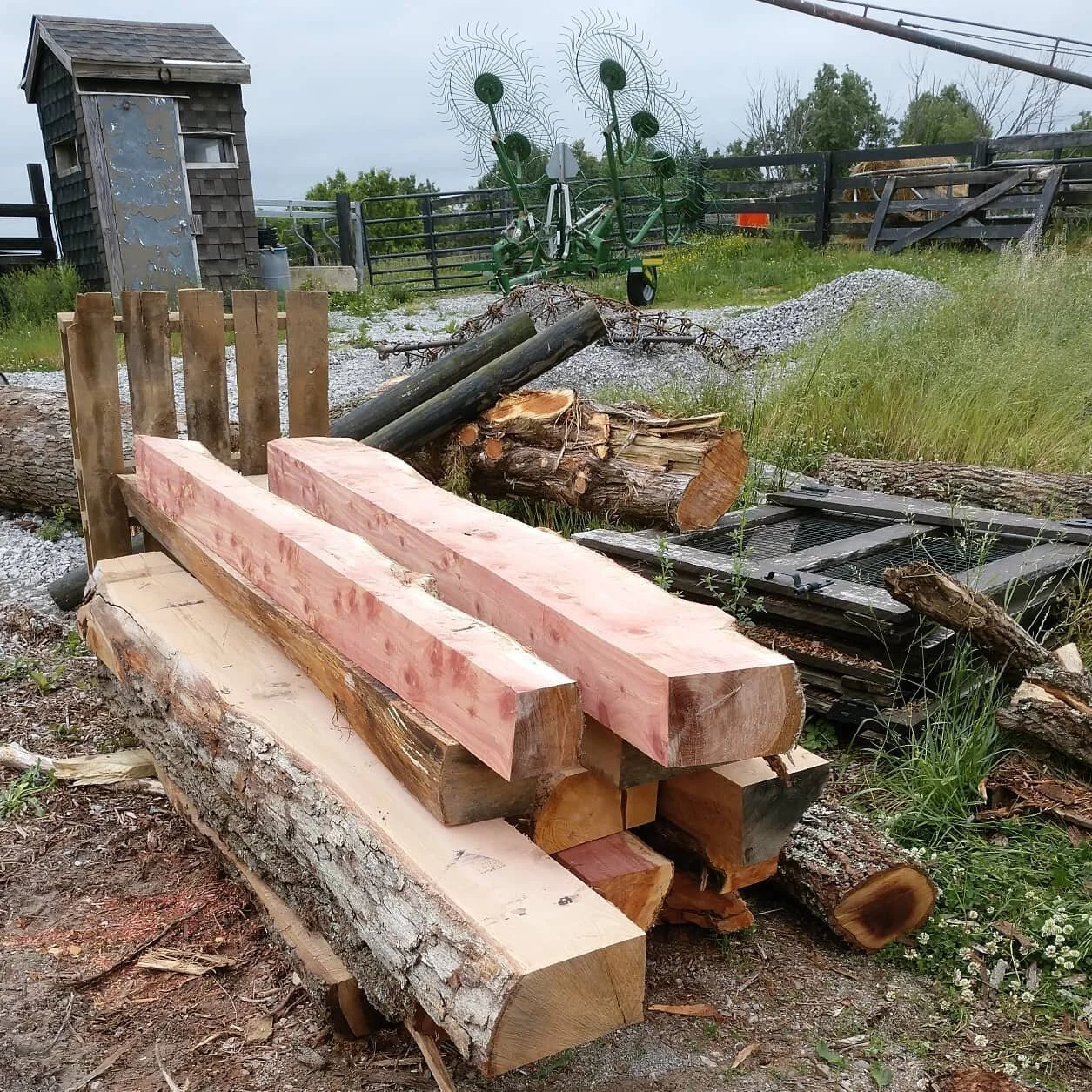 Mountains of mantles and cedar/walnut/oak slabs for a homebuilder client. All from reclaimed or saved logs.